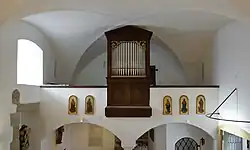 The central element of the church is the Baroque altar. He is flanked by statues of Saint Leopold and Saint Florian. The altarpiece shows a depiction of Saint George from 1827; it is the work of Nazarene painter Johann Stätter and was based on a sketch by Ludwig Ferdinand Schnorr von Carolsfeld. To the right of the altar, there is a late Gothic altar to Mary, which was erected in 1760. The depiction of the Madonna in the centre of the church dates from the early 16th century. There is a large, Baroque crucifix on the southern wall, which was originally part of an altar. The altar was placed on the northern external wall in 1732, but was removed in the 19th century. Further noteworthy elements of the church are a Gothic Baptismal font made of red marble (which dates to around 1500), an alms box decorated with rosettes, and a stoup (both date from the 17th century). The organ was made by Franz Ullmann in 1849.