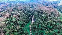 With an area of 6,000 km2 (2,300 sq mi), Kahuzi-Biega is one of the biggest national parks in the country. Set in both mountainous and lowland terrain, the park lies west of the town of Bukavu in South Kivu Province.[5] The smaller, 600 km2 (230 sq mi) eastern part of the park lies in the Mitumba Mountains of the Albertine Rift in the Great Rift Valley. The larger, 5,400 km2 (2,100 sq mi) western part is mainly lowland terrain stretching from Bukavu to Kisangani. It is drained by the Luka and Lugulu rivers which flow into the Lualaba River.[3] A 7.4 km (4.6 mi) wide corridor connects the two parts.[5] Two dormant volcanoes are set within the park's limits and lend their names to it: Kahuzi (3,308 m (10,853 ft)) and Biéga (2,790 m (9,150 ft)).[5]