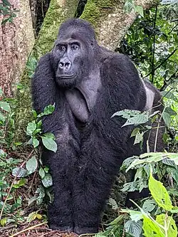 The national park protects a greater diversity of mammal species than any other national park in the Albertine Rift.[3] Among the 136 species of mammals identified in the park, the eastern lowland gorilla is the most prominent. According to a 2008 status report of the DR of Congo, the park had 125 lowland gorillas, a marked reduction from the figure of 600 gorillas of the pre-1990s conflict period, and consequently the species has been inscribed on the endangered list. The park is the last refuge of this rare primate.[8] According to the census survey of eastern lowland gorillas reported by the Wildlife Conservation Society in April 2011, at least 181 gorillas were recorded in the park.[9]