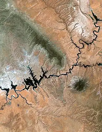 This topography is well illustrated in a synthetic aerial image (here, 450 kB), which looks northwest from a point near Navajo Mountain. The Kaiparowits Plateau is the darker area to the left, while the Escalante River Basin is the lighter area to the right. The Colorado River (as Lake Powell) runs across the bottom of the image, and at the upper right is the Aquarius Plateau and Boulder Mountain.