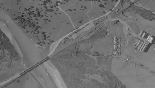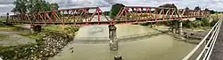 The railway crosses the Rangitīkei River on a truss bridge[16] with five 120 ft (37 m) spans and a 40 ft (12 m) abutment,[17] built in 1939. The piers are 46 ft (14 m) to 54 ft (16 m) deep.[18] Just upstream is a 1968,[19] or 1970, bridge carrying Halcombe Road.[20]