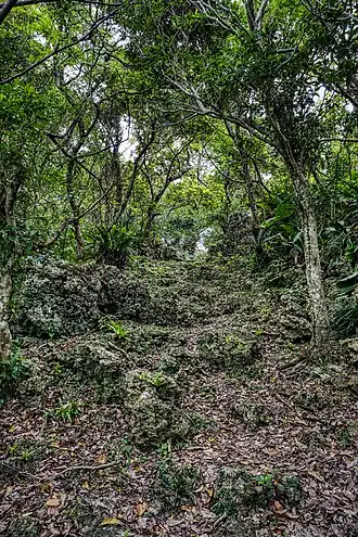 Kakinohana Castle is a kuruwa[1] style fortification on a hill overlooking the Pacific Ocean. The stone walls are built in the nozura[1] (stacked stone) style. No accurate details of the construction of this castle exist, but legend states it that it was built by the second son of Minton Aji, an Okinawan ruler around the 14th century.[2]