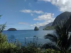 The Kalaupapa Peninsula remains one of the most remote locations in Hawaii due to unique volcanic and geologic activity over millions of years.[12] Specifically, Molokai's famous sea cliffs, which reach up to three thousand feet above sea level and are among the tallest in the world, are most responsible for restricting access. Geologists thought that these cliffs were carved by wind and water erosion, but it is now believed that they formed after a third of the northern portion of the island collapsed into the sea. The offshore islands—'Ōkala, Mōkapu, and Huelo—support this theory, housing original plant species found on Molokai over two thousand years ago such as the rare native loulu palm.[12] Mōkapu also hosts a remnant population of Emoia impar, the dark-bellied copper-striped skink, which was introduced to Hawaii more recently.