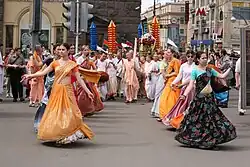 In Vaishnava etymology the word Hare refers to Hara (literally, captivating, carrying away), personifying goddess Radha who is the Shakti of Krishna ("nada shakti") or and remembers her as the one who stole the mind of Krishna. The word Hare, or Radha, is repeated eight times in the Kali-Santaraṇa mantra and is a reminder of her love for the divine Krishna.[9] Popular in Gaudiya Vaishnavism denomination of Hinduism, its devotees assert that the effect of reciting this mantra in Kali-Santaraṇa text is to imbue the pleasure principle emanating from the very innermost part of one's being, feel transcendental ecstasy and revive deep consciousness, remembering the love of God, and to getting rid of the harmful influence of the Kali Yuga.[12] The Gaudiya Vaishnava have traditionally asserted that this mantra should be recited audibly because the sound liberates the reciter and the listener.[3]