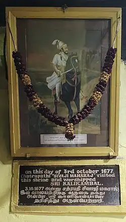 The temple was originally located closer to the sea shore at the site of the present-day Fort St. George.[1] When the British East India Company built the fort, the temple was relocated to the current site on 1 March 1640 CE[1] and the construction continued until 1678.[2] Chhatrapati Shivaji, the 17th century Maratha warrior-king and the founder of Maratha Empire, had paid a visit in this temple on 3 October 1677.[3][4] It is believed that a fierce form of Goddess was held in worship earlier and that this form was replaced with the shanta swaroopa (calm posture) form of Goddess Kamakshi by Adi Shankara. Tamil poet Subramaniya Bharathi was a regular visitor of the temple in the early 20th century.[4] The Tamil devotional hymn Ullam Uruguthaiya written by Andavan Picchi in 1952 was conceived and composed at the temple premises.[1]