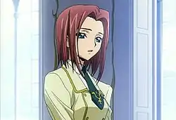 Kallen Stadtfeld (カレン・シュタットフェルト, Karen Shutattoferuto) is a fictional character in the Sunrise anime series Code Geass: Lelouch of the Rebellion. In the series, she is legally known as "Kallen Stadtfeld" at school, but prefers to be called by her original birth name and mother's surname, using Kallen Kozuki[1] (紅月カレン, Kōzuki Karen) during her revolutionary activities and life after the series concludes. Her Japanese voice actress Ami Koshimizu won "Best Actress in a Supporting Role" for her role as Kallen at the first Seiyu Awards in 2007.[2] Kallen was awarded 8th place in the 29th Anime Grand Prix,[3] then 17th and 16th, respectively, in the following two.