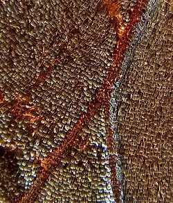 Males and females similar. Differs in the colour of the discal band on the upperside of the forewing; this is of a uniform pale blue of a slightly lighter or darker shade, varying individually, but not turning to white towards the costal margin as in the dry-season specimens. Underside: ground colour on the whole darker than in the dry-season form, but with the same protective colouring.[4][5] Wingspan 84–120 mm.