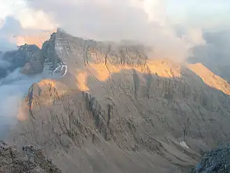 The Kaltwasserkarspitze is a mountain in the Hinterautal-Vomper Chain and, at 2,733 m (AA) m, is the fourth highest peak in the Karwendel mountains in Austria after the Birkkarspitze, Middle and Eastern Ödkarspitze. The Kaltwasserkarspitze is the eastern neighbour of the Birkkarspitze, its rugged summit dropping in a steep rock face to the valley of Kleiner Ahornboden. A long arête heads south from the mountain, on which are the Sägezähne ("saw teeth") and the Großer Heißenkopf (2,431 m (AA)) and which separates the Östliche Birkkar from the Raukarl.