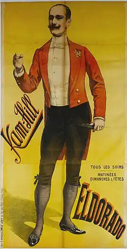 He began to sing from the lyric repertoire around 1885 in salons, before making his real debut at the Gaîté Montparnasse in 1890 in his trademark bizarre costume resembling a rider, with red coat, black silk trousers, a top hat and white gloves; he even sang on horseback at the Nouveau Cirque in Paris.[1] Yvette Guilbert and Kam-Hill appeared together regularly, often singing songs by Tarride.[2] He also appeared at the Eldorado, the La Scala, the Ambassadeurs, and the Folies Bergère.