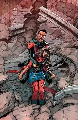 Kamala continued to appear in Zeb Wells and John Romita Jr.'s relaunched The Amazing Spider-Man vol. 5 (2022) as the personal assistant of Norman Osborn. The Direct commented that Kamala "has only appeared on 14 out of 646 pages and 37 out of 3204 comic panels of Wells' story thus far, which includes The Amazing Spider-Man #1-25, Dark Web #1, and Dark Web Finale #1".[140] Following a leak in May 2023, Marvel confirmed that Kamala will die in The Amazing Spider-Man #26 ahead of its publication on May 31.[16][141][142] In the issue, Kamala saves Mary Jane Watson from being sacrificed by the dimension-hopping Emissary by using her shapeshifting abilities to take on Watson's appearance. The Emissary attacks Kamala, assuming she is Watson, which botches the Emissary's ritual, and leads to his death. However, Kamala is unable to heal from the wounds sustained during that attack. Kamala reveals her identity to Peter before dying in his arms.[143][144][145]