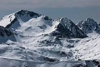 Kamenitsa (Bulgarian: Каменица [ˈkamɛnit͡sɐ]) is a peak in the Pirin mountain range, south-western Bulgaria. It is located in the northern part of Pirin on the 22 km-long Kamenitsa secondary ridge between the summits of Malka Kamenitsa to the north and Yalovarnika (2,763 m) to the south.[1] Its height is 2,822 m which ranks it on fifth place in Pirin, behind Vihren (2,914 m), Kutelo (2,908 m), Banski Suhodol (2,884 m) and Polezhan (2,851 m).[1][2] The peak is built up of granite blocks covered in lichens.[2]