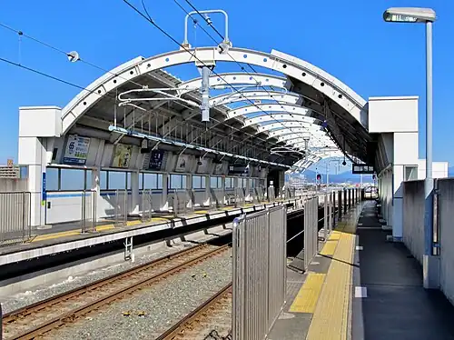 The station is an elevated station with dual opposed side platforms. It is staffed during daylight hours. The station building has automated ticket machines, and automated turnstiles which accept the NicePass smart card, as well as ET Card, a magnetic card ticketing system.