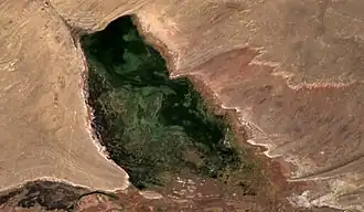 The lake is located 30 kilometers (19 mi) to the ESE of Ulanbel village. The ruins of ghost town Kishi Kamkaly, abandoned in 2019, lie by the northern end of the lake. The lake water is used for watering livestock grazing in the surrounding area.[1][2][3]