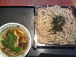 Cold, cooked soba eaten with a dipping sauce of duck meat and Welsh onions. It is said to have been conceived in 1963 at the Ginza Chōji-an (長寿庵) restaurant[21]