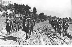 The Polish command decided not to wait passively for further enemy strikes. During the night of September 2/3, an 80-strong assault unit led by Lieutenant "Dolina" carried out a surprise raid on the Kaminski Brigade troops quartered in Truskaw. With minimal losses on their side, the Poles completely routed two strong enemy units, capturing large quantities of weapons and ammunition (including a 75mm caliber cannon). Between 91 and 250 Kaminski Brigade troops were killed, and several to a dozen artillery pieces as well as nearly 30 ammunition wagons were destroyed.[218][219][220] That same night, Major "Okoń" led a similar raid on the neighboring Sieraków, but the Polish strike missed its target as the enemy had abandoned the village the previous day.[221][222] During the night of September 3/4, another raid was conducted, this time targeting two Kaminski Brigade companies quartered in the village of Marianów near Leszno. In a battle lasting less than half an hour, an 80-strong cavalry unit commanded by Captain "Nieczaj" and Second Lieutenant "Dąbrowa" completely crushed the enemy outpost, killing between 60 and 100 Kaminski Brigade troops. During the raid, a quantity of weapons was also captured, and between 22 and 24 prisoners were taken[223][224][225] (they were executed when items and valuables looted in Warsaw were found in their possession).[226] As a result of these defeats, Kaminski Brigade units withdrew on September 4 to the line of Laski–Izabelin–Hornówek–Lipków.[227] The Kaminski Brigade troops did not dare to launch further offensive actions against the Kampinos Group, limiting themselves to terrorizing the residents of nearby villages.[221] On September 15, the remnants of Kaminski Brigade were withdrawn from the Warsaw area.[228]