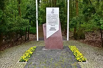 In September, the Kampinos Group also engaged in several defensive battles. On September 14, soldiers of the Palmiry-Młociny Regiment repelled a German punitive expedition intending to pacify Buda and Mariew.[237] Meanwhile, in mid-September, the Germans, supported by armored cars, attempted to dislodge Home Army soldiers from Pociecha. Covered by minefields, soldiers of the Sochaczew Battalion managed to repel all attacks. The Germans lost several killed and one armored car in the vicinity of Pociecha.[238][239]
