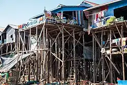 Many houses and buildings are constructed on stilts ranging from 6 m to 9 m to accommodate the changes in water level between wet and dry seasons.[1]