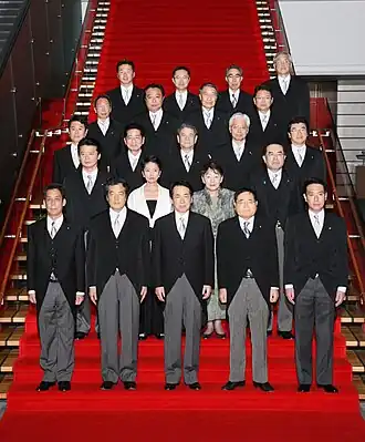 ![]() Prime Minister Naoto Kan (front row, centre) with his reshuffled cabinet inside the Kantei, September 17, 2010 | |