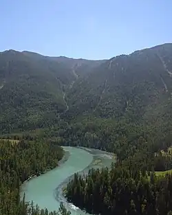 The Kanas River (Chinese: 喀納斯河) is a river in Burqin County, Altay Prefecture, Xinjiang, China. It originates from the main peaks of the Altai Mountains. It is a perennial river with a total length of 125 kilometers, an average width of about 50 meters, and a maximum width of 100 meters. Converging with the Hemu River to form the Burqin River, the water velocity at the Kanas Bridge is 2.5 meters per second under the perennial water level.[1]