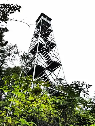 The Kane Mountain Fire Observation Station is a historic fire observation station located on Kane Mountain at Caroga in Fulton County, New York. The station includes a 60-foot-tall (18 m), steel-frame lookout tower erected in 1925, an observer's cabin built about 1960, and foot trail. The tower and trail are contributing resources. The tower is a prefabricated structure built by the Aermotor Corporation and provided a front line of defense in preserving the Adirondack Forest Preserve from the hazards of forest fires.[5] There was previously a south trail that lead from Schoolhouse Road to the summit. This trail was closed because it crossed private lands and the landowner revoked permission in 2018.[6][7][8][9]