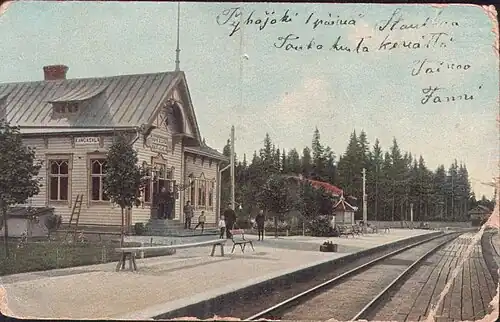 Upon the foundation of the station, a village began to form around in the mostly uninhabitated area. Some industry developed as well; the Halimaa sawmill was founded in the 1920s, operating for about 30 years.[5] Passenger numbers at Kangasala grew quickly over its first two decades: 16,098 in 1900, 19,079 in 1905, 26,569 in 1910, and 36,512 in 1920.[4] At first, the railyard had four switches, the number of which later expanded to six, and at its fullest extent, approximately 1.3 kilometres (0.81 mi) of track.[2]