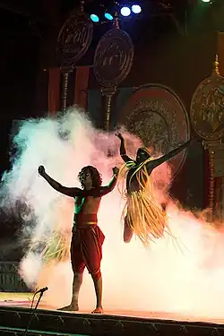 They dance to the sound produced by the beats of instruments such as Kaase or Dholu.[1] In the center of the circle, four singers wearing bells sing folk songs and the rest of the dance troupe dance to the tune of the songs.[1] The traditional song played is called the Karungilo and at the end of the dance, a song called Aati Kalenje is performed.[7] Amidst the dancing, a dancer appears wearing a mask and black paint smeared across the body imitating the spirit god Koragajja and dances in a unique way to draw the attention of the people.[1] Other people surrounding the dances make noises and make Koo sounds.[1]