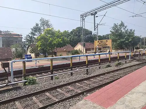 Kannur railway station (formerly Cannanore railway station)(station code: CAN[5]) is an NSG–2 category Indian railway station in Palakkad railway division of Southern Railway zone.[6] It is the largest railway station serving the City of Kannur in Kerala. It lies in the Shoranur–Mangalore section of the Southern Railway zone. It is the largest railway station in terms of area and number of tracks in North Malabar region. At ₹62 crore (equivalent to ₹77 crore or US$9.1 million in 2023) in financial year 2018–19, it is the fifth largest in terms of passenger revenues in Kerala, and second largest under Palakkad railway division.[7] Almost all major trains connecting the other parts of Kerala, Tamil Nadu, Andhra Pradesh and North India halt here.[8] Kannur and Kannur South (Station Code: CS) are two different stations which serve Kannur city.[9][8]