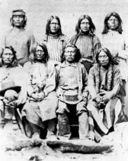 One of Kanosh's wives was Sally, a Southern Paiute who had been raised in Young's household. This relationship is a key part of why Kanosh's band worked so closely with the Latter-day Saints.[8] Another of Kanosh's wives was a Paiute named Mary who had been raised by Latter-day Saints in Payson, Utah Territory.[9] Kanosh built a regular cabin for her, whereas his other three wives lived in wikiups.[9]