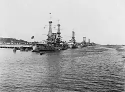 A major element of Plan Orange was to establish a series of island bases to be used as stepping stones, rather than making a direct strike against Japan. What no one anticipated was the development of the US Navy Service Squadrons and the secret naval bases they created. An example of this was at Ulithi, where Service Squadron 10 made use of the atoll's huge anchorage to create a massive base in the middle of the Pacific Ocean. There they could repair and refit the fleet, and maintain the supply of tankers which convoyed out to refuel the fleet while it was on operations. Bases such as Ulithi allowed the USN to operate for extended periods in far distant waters. With the naval base at Ulithi, many ships were able to deploy and operate in the western Pacific for a year or more without returning to Pearl Harbor.[47] Over the last quarter of 1944 through the first quarter of 1945 the large lagoon of the Ulithi atoll was the largest and most active anchorage in the world.[48]