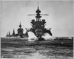 - ^ The "Orange Fleet" was the name given to the Japanese fleet. The term stems from pre-war planning, called the "color plans" because each nation included was given a color codename: the British Royal Navy was "Red," the German Navy "Black," and so forth. The Imperial Japanese Navy was the "Orange Fleet," while the US was the "Blue Fleet". The "Big Blue Fleet" was the massive fleet the US Navy anticipated it would field to win a war with Japan, expected to come into being by late 1943 or early 1944.[43]