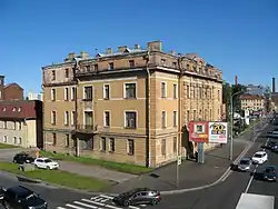 In the vicinity of the street there also have been some buildings originally erected by 1914 for the joint stock Russian Renault[17][18] automobile works. The buildings were added[19] to over the decades after the Soviet nationalisation. Having been many times restructured under different names, this machine-building factory was eventually given the name of its head designer of its main products - aviation engines[20] Academician Vladimir Klimov, whose name was also given to the adjoining city square with a roundabout. By 2020 the factory premises have been vacated for redevelopment,[20] mostly for housing purposes. For retail consumers the factory produced gas lighters and was entrusted to design the torch[18] for the 1980 Summer Olympic Games that were held in Soviet Union in Moscow, Leningrad, Tallinn etc. Two mansions built before 1917 can be seen in the street (No 17[21]) and next to it.[22]