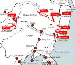 The roots of anti-Soviet sentiment in Imperial Japan existed before the foundation of the Soviet Union itself. Eager to limit tsarist influence in East Asia after the Russo-Japanese War (1904–1905) and then to contain the spread of Bolshevism during the Russian Civil War, the Japanese deployed some 70,000 troops into Siberia from 1918 to 1922 as part of their intervention on the side of the White movement, occupying Vladivostok and other key points east of Lake Baikal.[7][8] After the international withdrawal from Russian territory and the establishment of the Soviet regime, the Imperial Japanese Army, mindful of the Soviets' potential as a military power and in keeping with the convention of Russia as a traditional enemy, made contingency plans for a future war. Initially defensive in nature, they envisioned an invasion by the Red Army into Chinese territory that would then be parried by a Japanese counterattack from Korea, with the decisive battlefield being southern Manchuria.[9] After the Japanese invaded Manchuria in 1931, Japanese and Soviet troops found themselves facing one another along a border thousands of kilometers in length. To protect the puppet state of Manchukuo and to seize the initiative early against the Red Army, the IJA adopted a policy of halting any Soviet advance along the border and fighting the greater part of the war in Siberia, an "epoch-making change" in Japanese strategic thought. The transition from the strategic defensive to the strategic offensive would not be reversed until 1945, when Japan was facing disaster during the Pacific War. Moreover, Japanese plans progressively increased in scope from relatively small-scale operations to gigantic multistage campaigns, which envisioned seizing virtually the entire Soviet Far East as far as Lake Baikal.[10]