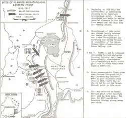 ![]() A map outlining the initial Japanese offensive moves against the Soviet Union, with final objective being a line that ran along the western slope of the Greater Khingan Range | |