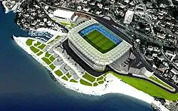 On 11 July 2014, HNK Rijeka President Damir Mišković released a detailed structure design for the new Kantrida stadium.[18] The current stadium was scheduled to be demolished, and a new, state-of-the-art stadium was to be built at the same location. The construction of the stadium was to be privately funded, with the cost estimated at €25 million, excluding the cost of commercial facilities (hotel and shopping centre) next to the stadium.[19] During the stadium construction, HNK Rijeka play their home games at the newly built Stadion Rujevica. On 12 April 2019, a memorandum of understanding regarding the construction of the new stadium was signed between Stadion Kantrida LLC and Shaanxi Construction Engineering Group Corporation.[20] These plans did not materialise, and the project remained on hold for close to a decade. In December 2023, plans were unveiled that, in addition to the stadium, investors plan to build a commercial complex, which will include three residential highrise towers and a hotel, with a total cost exceeding €100 million. The new Kantrida stadium will be located at the previous location but rotated 90 degrees from the previously proposed location, facing north-south. The facility is to be designed to accommodate 12,000 to 14,000 spectators and meet UEFA's fourth-category standards.[21]