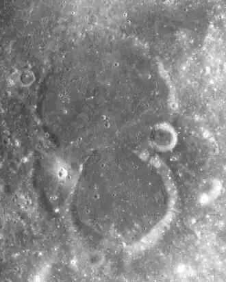 This crater forms part of a merged pair with Helmert to the south. There is a gap in the sides of the crater where they are joined together, and they share a common floor that has been resurfaced by lava. The outer rim of this crater now forms little more than a shallow ring in the surface, with the rim lowest along the northern side. It is unmarked by impacts of significance. However, there is a small crater along the southeastern edge where the rim joins that of Helmert.