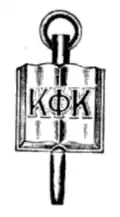 The badge is in the form of a key displaying an open book in dull gold with the Greek letters ΚΦΚ in black enamel in relief across the pages of the book.[3][9] The fraternity's colors are green and white.[3] Its flower is the white carnation.[3]