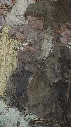 At the Kazan Art School, Fechin anticipated completing his final work, which he was not permitted to paint as a free student in academic workshops.[32][34] His arrival in Kazan was an event that attracted the attention not only of the students and teachers of the school, but also of the entire Kazan art community.[32] The new teacher immediately made a strong impression on the students. Especially their admiration increased when they saw the Kapustnitsa (Solovyov calls this canvas Kapustnik), which was placed in the assembly hall of the Kazan Art School to complete the work on it. It also made a great impression on the teachers of the school.[35] The artist German Melentiev wrote in his memoirs that when Fechin placed his unfinished work in one of the halls of the art school, all approaches to it were blocked. Curious students peered through the keyhole to see Fechin at work. One of the school employees, feeling sorry for the students, began to open the hall for them when Nicolai Fechin was absent. The students, fearing the artist's return, only had brief glimpses of the unfinished canvas, struggled to understand the subject, but were nonetheless struck by the master’s immense size and unconventional technique. The diffuse light in the hall gave the painting an "enchanting and exciting" character.[36]