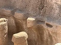 Necmi Karul, an archeologist at Istanbul University, told Anadolu Agency in 2019, “Last year, excavation work restarted in Karahan tepe [Kectepe] – around 60 km from where Göbekli tepe is located – and we encountered traces of special structures, obelisks, animal sculptures, and descriptions as well as similar symbolism”.[7] The site was filled with dirt and rubble at some point, preserving T-topped columns carved into bedrock.[8] These structures have been described as 'phallic totems'.[1]