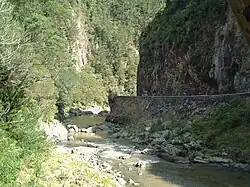 At Karangahake, several walks and tracks ranging from 30 minutes to over 2 hours start at the Karangahake Reserve car park and picnic area.[2] One of the most spectacular walks in the area is the "Windows Walk", a loop walk that leads through the old gold mining tunnels of the Talisman Mine, crosses the Waitawheta River over a suspension bridge, and joins the Crown Tramway Track back along the cliffs of the Waitawheta Gorge.[4][5] The path follows the route of a bush tramway and passes by "windows" in the cliff face at the end of mining tunnels, which were used to tip tailings down into the Waitawheta Gorge. Two of the mining tunnels, which are about 2 metres (7 ft) tall and wide, are safe to enter. They end abruptly after about 50 metres (164 ft) and are home to glowworms and cave weta.