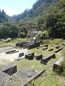 The Talisman, Crown and Woodstock stamping battery remains at the lower end of the gorge and are some of the most significant reminders of the time. Their location at the confluence of the Waitawheta River and the Ohinemuri River was chosen to make use of the available water power of the rivers. Mining at the batteries occurred roughly from the 1880s to 1950s, with the most productive years around the turn of the century,[2] when the area produced 60 percent of the total gold from New Zealand. The batteries used to crush the ore from the extensive tunnels mined through the steep local mountainsides of the Waitawheta Gorge, with the Victoria Battery, one of the largest and most advanced at the time.[3]
