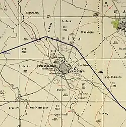 During the British Mandate of Palestine period in the 20th century, the village houses were built of adobe brick and it relied on the nearby town of al-Faluja for medical, commercial, and administrative services. Karatiyya itself, had a mosque, a grain mill, and an elementary school—the latter was built in 1922 and had an enrollment of 128 students in the mid-1940s. Domestic water was supplied by two wells dug within the village and the primary agricultural crops were grain and prickly pears.[6]