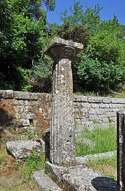 The cella did not include either a porch or an adyton and the lack of a frieze may be indicative of Ionian influence.[5] The porch may also have disappeared due to a landslide.[4] Many of the tiles on the roof of the temple bore inscriptions of names, likely of chief magistrates who were contemporary to its construction or renovation periods.[7] The names on the tiles included: Aristomenes, Thersia, and Damon.[7] The temple's architectural style is hexastyle-peripteral.[13] The period of the temple is estimated between 500 B.C. to the middle of the fifth century B.C.[1][7] Kardaki Temple is the only archaic temple in Greece known to lack an epinaos, an omission similarly observed elsewhere in two temples at Selinus and Assos.[14][15]