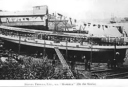 Kareela was launched on 31 May 1905. Among those present were Mr Russell (chairman of directors), W G Todd (secretary Sydney Ferries, Limited), and Mr Sinclair (of Morrison and Sinclair). The vessel was christened by Miss Enid Russell (thought to be the chairman's daughter), who broke a bottle of champagne on the propeller of the vessel.[2] The ferry's trials were on 7 September 1905 and she entered service 4 days later[4] initially on the Neutral Bay run. Kareela earned the nickname "The Box", which may have been due to appearing to not float any lower in the water no matter how many passengers she was carrying.[5]