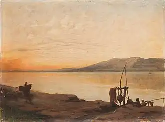 Inspired by his travels in the Middle East, Karel Ooms painted many Orientalist compositions. A portion of these are landscapes he painted on site. These include works such as By the Nile and View of Jericho. Others depict dancers and public festivities. Karel Ooms further painted a few works such as Dreaming in the harem, which reflected the contemporary interest in the theme of the harem and the odalisque in Orientalism.[10] One of his Orientalist works – a portrait of an Egyptian woman entitled The woman of Cairo – is part of the Shafik Gabr Collection in Cairo.[11]