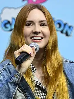 In February 2014, Gillan was cast as the lead in Selfie, an American single-camera sitcom for ABC produced by Warner Bros. Television which was greenlit for the 2014–2015 US television season. Gillan played a socialite named Eliza Dooley, a modern-day take on Eliza Doolittle, who is obsessed with social media. This was Gillan's first time in the lead role of an American television series.[37][38][39] The series was cancelled by ABC on 7 November 2014 after seven episodes;[40] the remaining six episodes were made available on Hulu starting 25 November 2014.[41] Selfie still has a dedicated following of fans years after its broadcast[42] especially in China,[43][44][45] where there is still a large demand for a sequel. Initially, there were talks of a Selfie movie revival with Stars Collective, but progress has been stopped due to the Warner Brothers not selling the film rights.[46] In May 2013, Karen Gillan was cast as Nebula in the Marvel superhero science fiction film Guardians of the Galaxy,[47] which was released in August 2014.[48] Gillan had her head shaved bald for the role, which Marvel turned into the wig that Gillan wore during the production of Selfie.[49] In May 2014, Karen Gillan was cast in the Western film In a Valley of Violence directed by Ti West, opposite John Travolta, Ethan Hawke and Taissa Farmiga. Karen Gillan portrayed Ellen, the older sister to Farmiga's character.[50] She also appeared in TV on the Radio's "Happy Idiot" music video, released on 3 October 2014.[51]