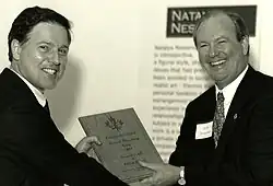He went to the United States as a Fulbright International Scholar[17] where he had residencies at a number of theatres including Meadow Brook Theatre (MBT) in Michigan, Oregon Shakespeare Festival, Kennedy Centre, Washington DC, and LaMama, New York.[18] He has written and edited several international publications and was Editor in Chief of ARABICA magazine,[19] the leading nationally distributed Arab-American publication[20] with an independently certified readership of over 100,000 readers.[21] He supervised EU, US and Canadian government funded media training programs in North Africa and South Asia.[22][23] He was Executive Director of the US-Arab Economic Forum and a member of the Canadian delegation led by Foreign Minister Pierre Pettigrew to the Organisation for Economic Co-operation and Development (OECD) conference on Good Governance in the Arab World,[24] as well as a member of the United Nations Development Programme (UNDP)'s Programme on Governance in the Arab Region (POGAR, 1999–2005) and Communications Advisor and Manager of External Affairs for the Middle East and North Africa for the World Bank in Washington, DC.[25]