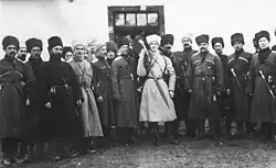 In August 1917, he participated in the march of the Wild Division to Petrograd.[15] By order of the army and navy, on October 8, 1917, captain Karim Khan Iravanski was awarded the military award - the George weapon.[16] He arrived in the North Caucasus in October 1917 with the Kabardin Cavalry Regiment. In November of the same year, Karim Khan protected the local population from bandit attacks in the village of Akhlovo (now Nizhniy Kurp) in Little Kabardia.[17]