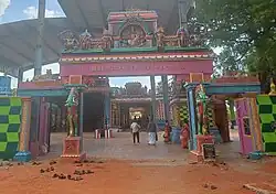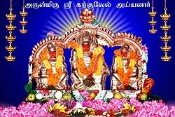 It is said that the presiding deity of the Ayyanar has come from a tree known as Karkuva. He is also called Karkuva Ayyan, Karku Velappan, Karukkuvalai Ayyan, and Karkuvel Ayyanar, among other names.[2] He is found with his consorts, goddess Poornam and goddess Porkamalam, in a sitting posture. There are also separate shrines for other deities.[1] Other Gods there include Periyandavar, Udhiramadan, Malayamman, Ivar Raja, Vanniya Raja, Vannichi, Pechiyamman, Ponirulapar, Kallar Sami, SolkelaVeeran Thuppakki Madan, and Sarvasakthi Amman.[3]