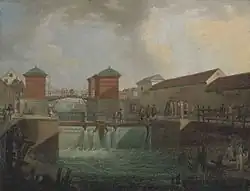 Not only the environment was rebuilt, the gates of the lock gad to be replaced in 1820, the whole construction was subject for a comprehensive repair in 1836 and closed for three months autumn 1839. Half a dozen metal pump stocks 12 inches (300 mm) in diameter were found in the embankment but not understood as such, the entire machinery therefore thrown out of gear, while skippers exceeding the permissible draught attempted to pull their ships over the sill. The Blue bridge was repaired and en new pivoted bridge built by the red one. Finally in 1831, Lieutenant colonel Gustaf Adolf Lagerheim (1788–1845), who had worked at the Göta Canal, was commissioned to investigate a new bridge and eventually became the first person to propose a new seaway south of Södermalm, a suggestion however reject as to expensive, why he instead made a proposal for a new lock before he fell out with the building authorities and left the capital. Successive plans for a new bridge were first encouraged as His Majesty personally granted subsidies worth 20,000 riksdaler annually during a period of ten years starting from 1837, provided that the city allocated the same amount to cover the cost was estimated to 394,000 riksdaler, the plans then fell upon problems however, as a competition in 1841 awarding the winning proposal 200 ducats produced no entries, and a new competition in 1843 awarding 500 ducats resulted in the same outcome. The savior appeared in 1845 when lieutenant colonel Nils Ericson (1802–1870), who had worked for Baltzar von Platen at Göta Canal, delivered a proposal for which was, except for the award, also given 2,000 riksdaler for a supplemental investigation. The new lock required to be 9,5 meters wide, 3,6 meters deep at low tide, while the distance between the gates should be made 45 meters. The cost was estimated to 422,000 riksdaler, and Ericson's recompense settled at 40,000 riksdaler to be paid once the sluice was completed.[6]