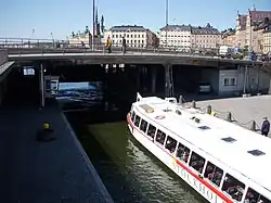 Karl Johansslussen ("Lock of Charles John") is a lock and a sluice, along the Söderström river connecting and controlling the flood discharge between Riddarfjärden, the easternmost part of Lake Mälaren, and Saltsjön, the section of the Baltic Sea reaching into central Stockholm, Sweden. The lock is 75 metres long, 10 metres wide and 3.90 metres deep. The maximum height is 3.8 metres.[2] The lock is closed from 2016 to 2021 due to large reconstruction works in the area.